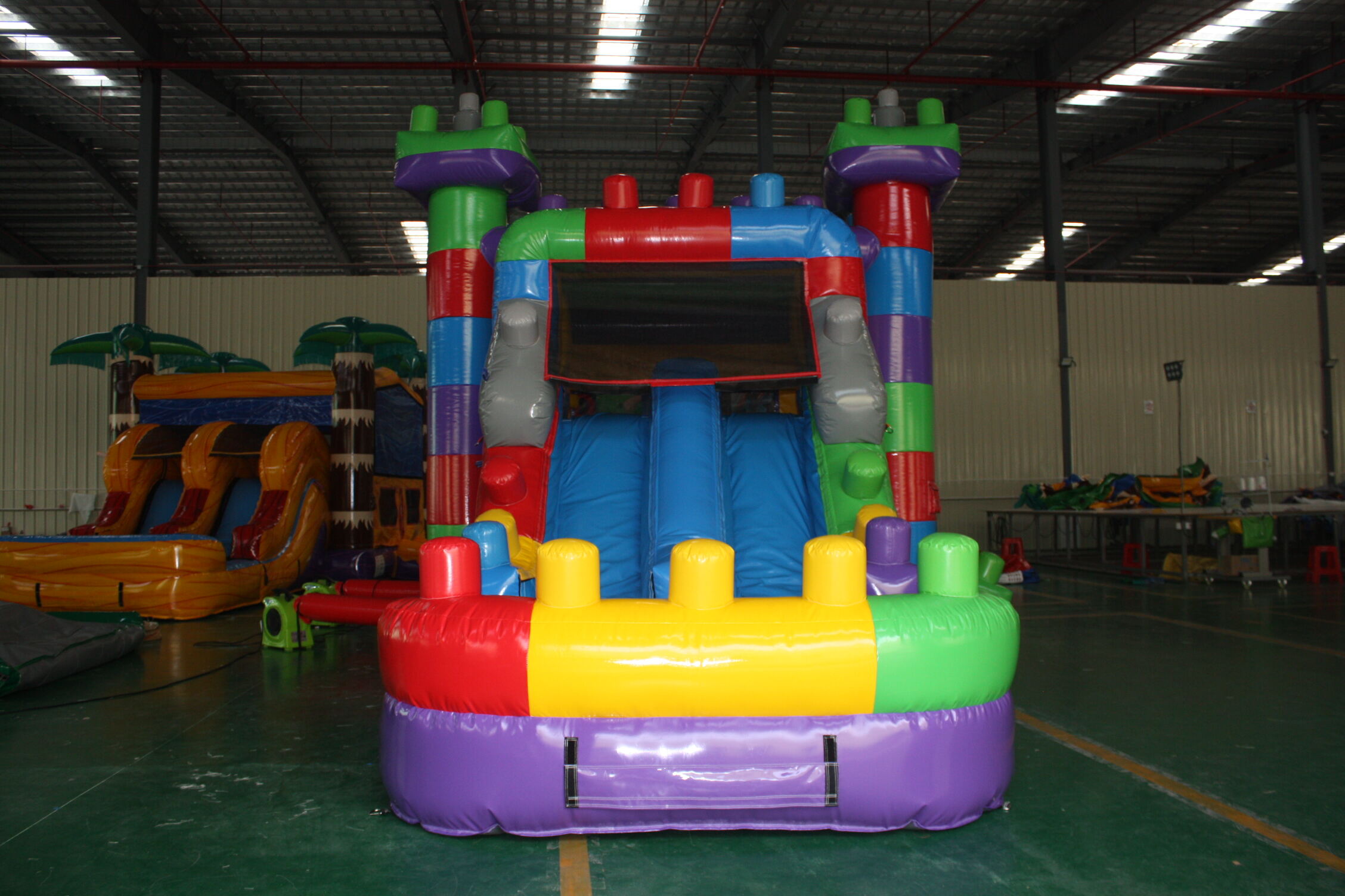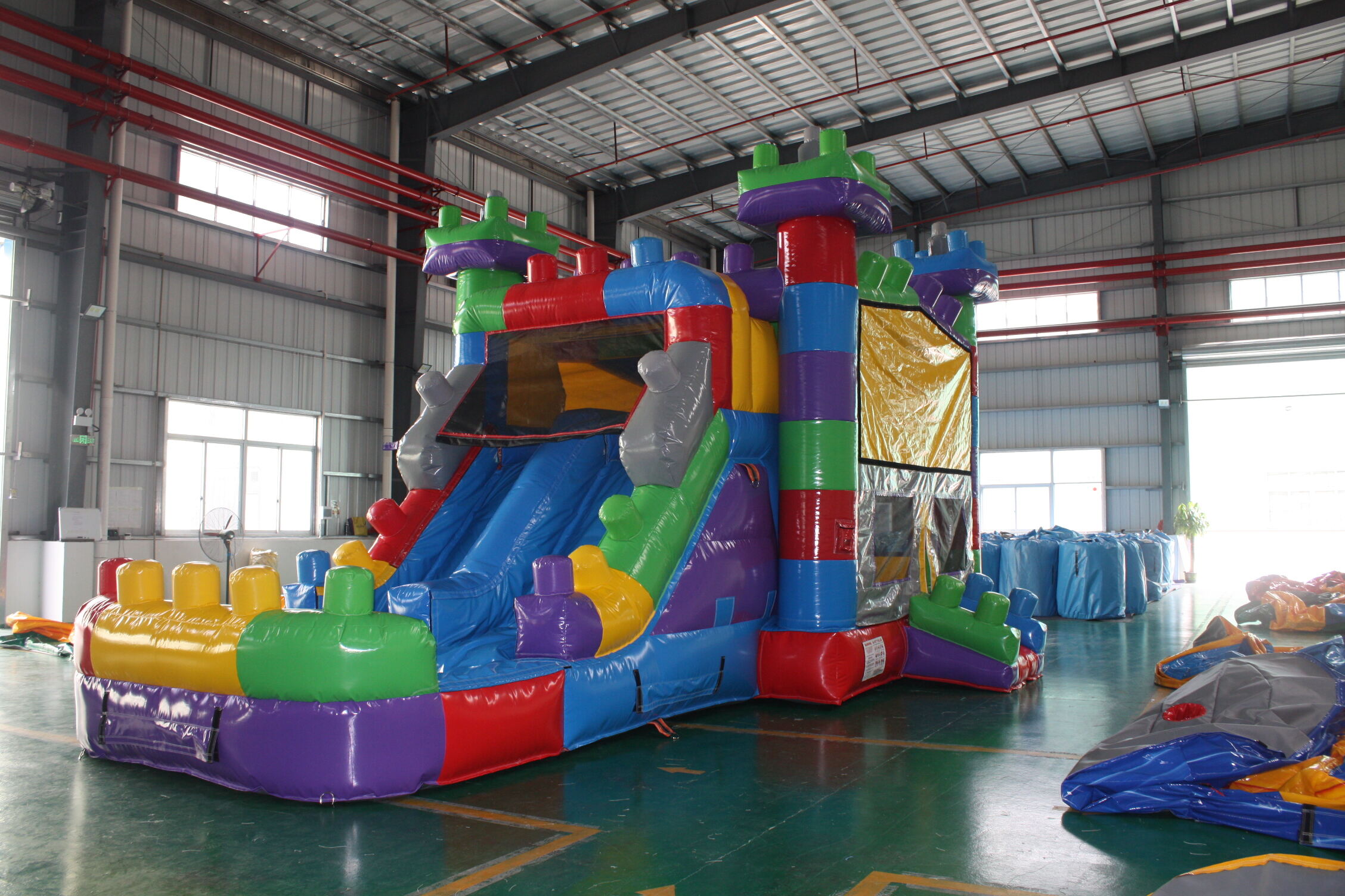 Iconic Lego-inspired appearance: Bold primary color scheme (red, yellow, blue), realistic building block 3D texture, high-definition digital printing, serves as a photogenic centerpiece for construction-themed events and brand promotion campaigns Flexible customization options: 1-unit minimum order supported, custom logo printing and size adjustment available for distributors targeting educational institutions, entertainment venues and event rental markets Safety compliance: Meets EN14960 & ASTM commercial safety standards, reinforced mesh safety net, non-slip bounce surface, and heavy-duty anchor stakes for maximum stability during both dry and wet use |