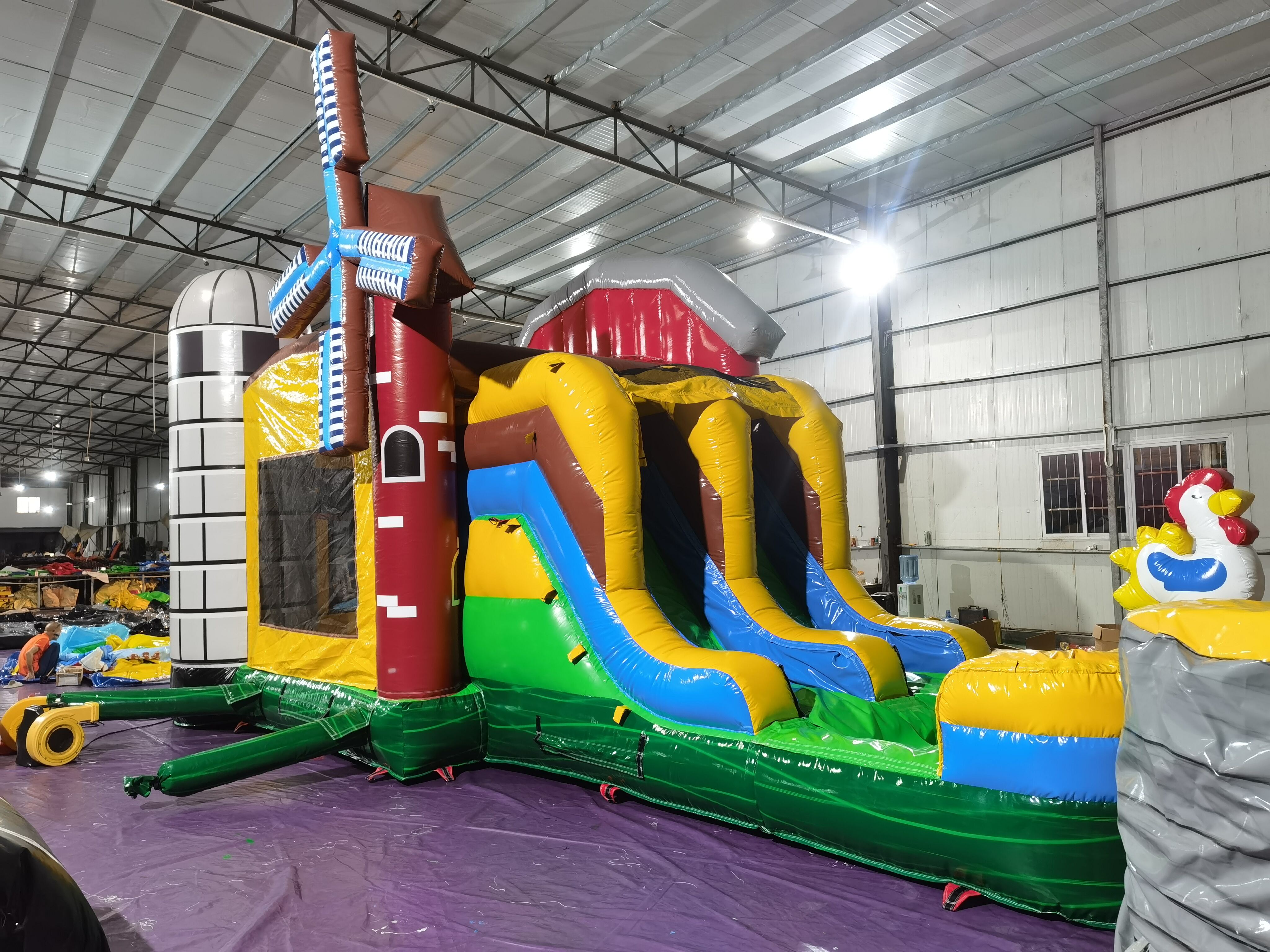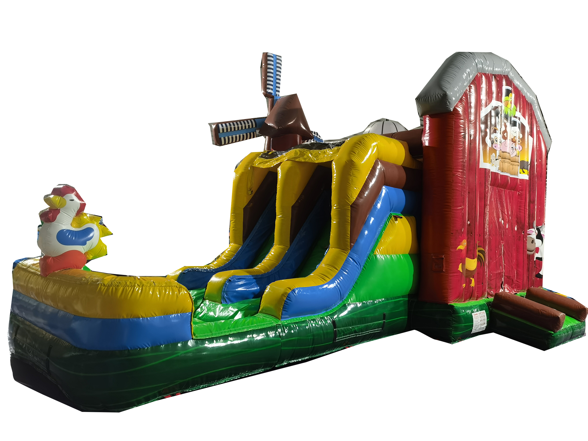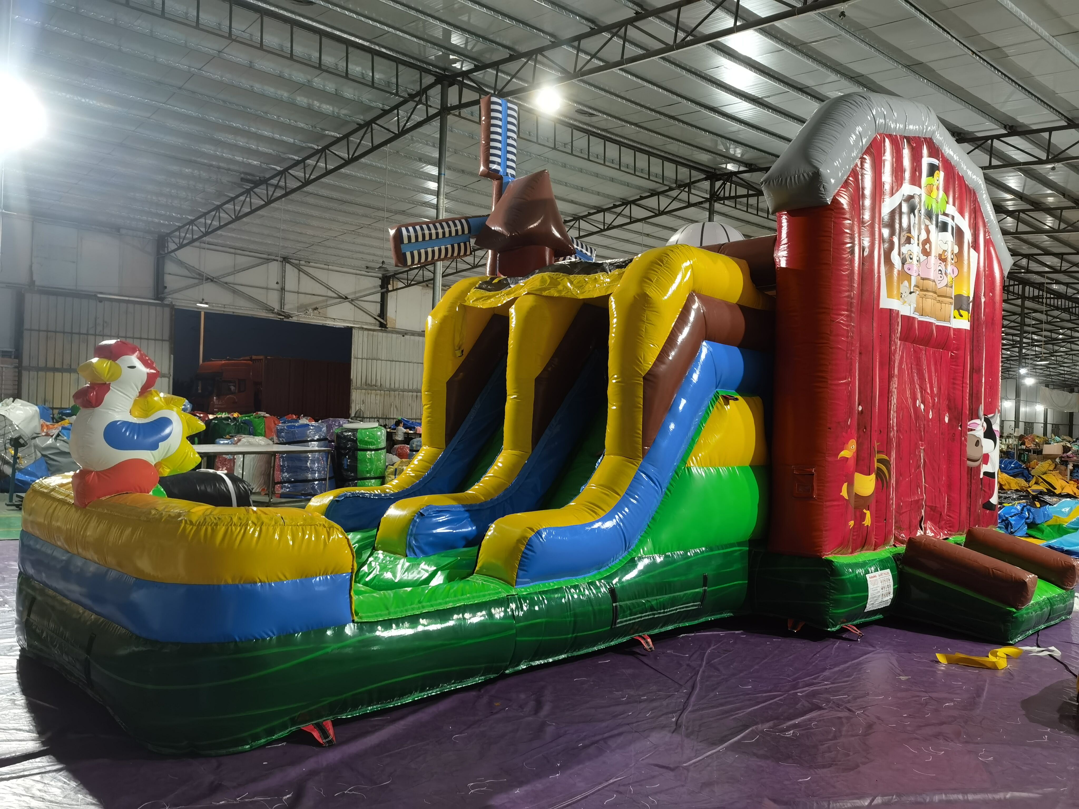 Pagalma vecāku-bērnu lauksaimniecības dzīvnieku pūšamā slīdņa aktivitāte Ģimenes drošs lauksaimniecības pagalma pūšamais daudzslīdņu kombinētais komplekts mājas izklaišu vajadzībām Pagalma tematiskais pūšamais slīdņa kombinētais komplekts ģimeņu satikšanās pasākumiem